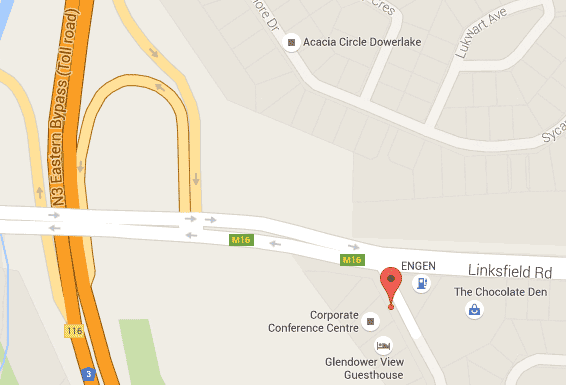 From the CBD take the M2 East. Take Francois Oberholzer turn-off onto the N3 North. Take the third off-ramp (Linksfield M16) and turn right at the traffic light. As you turn, proceed into the right hand lane and cross over the motorway. About 50 metres after crossing the motorway turn right into Edward Drive (before the Engen Garage). Corporate Conference is on the right (just before the Boom).